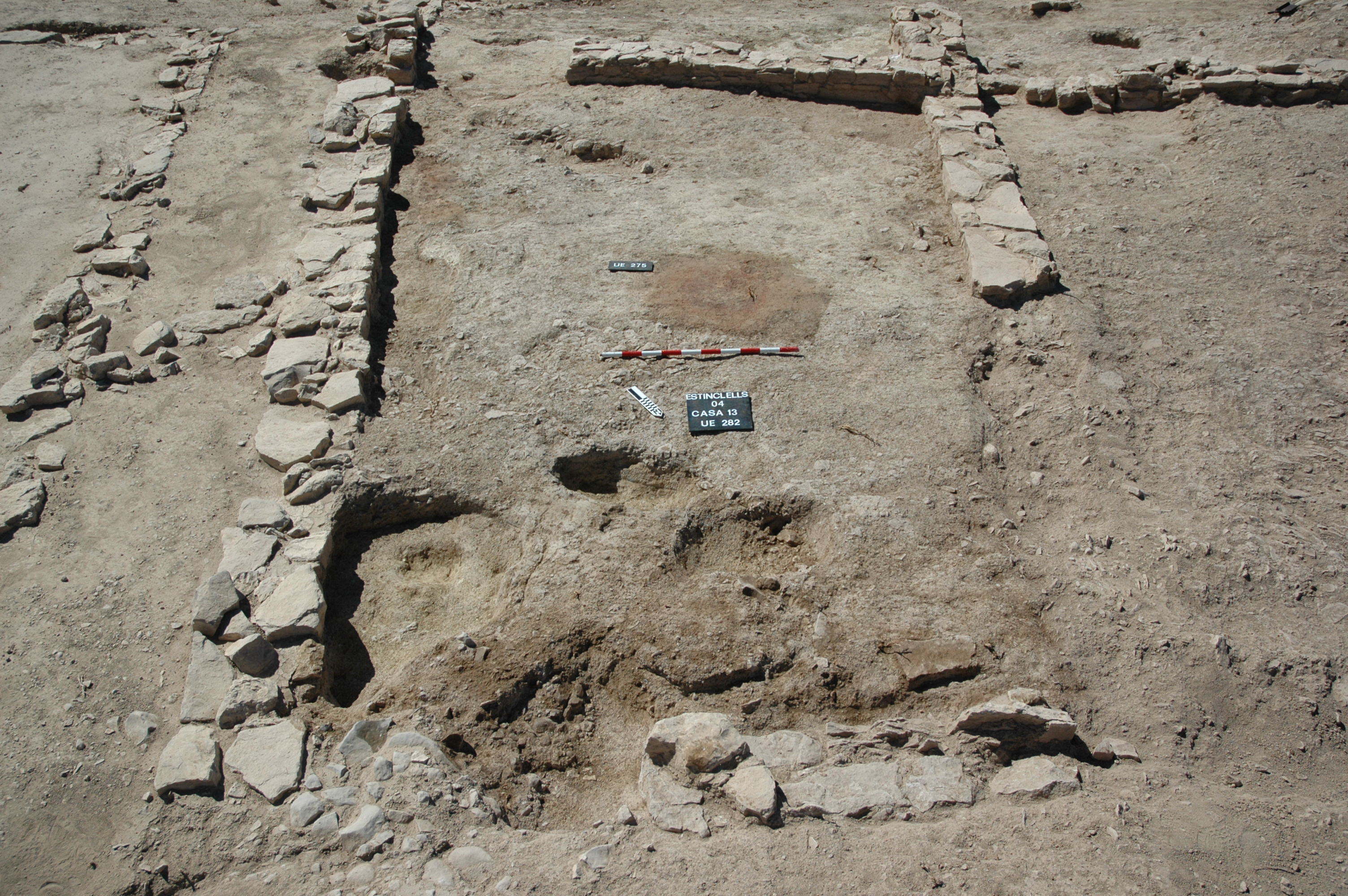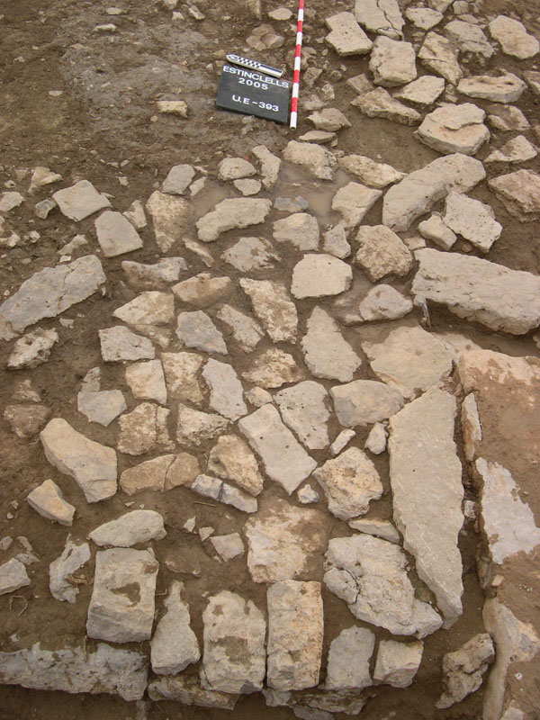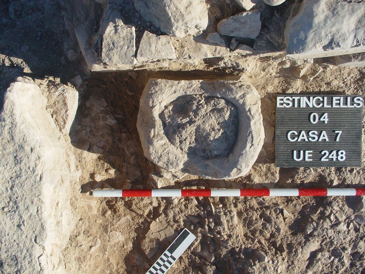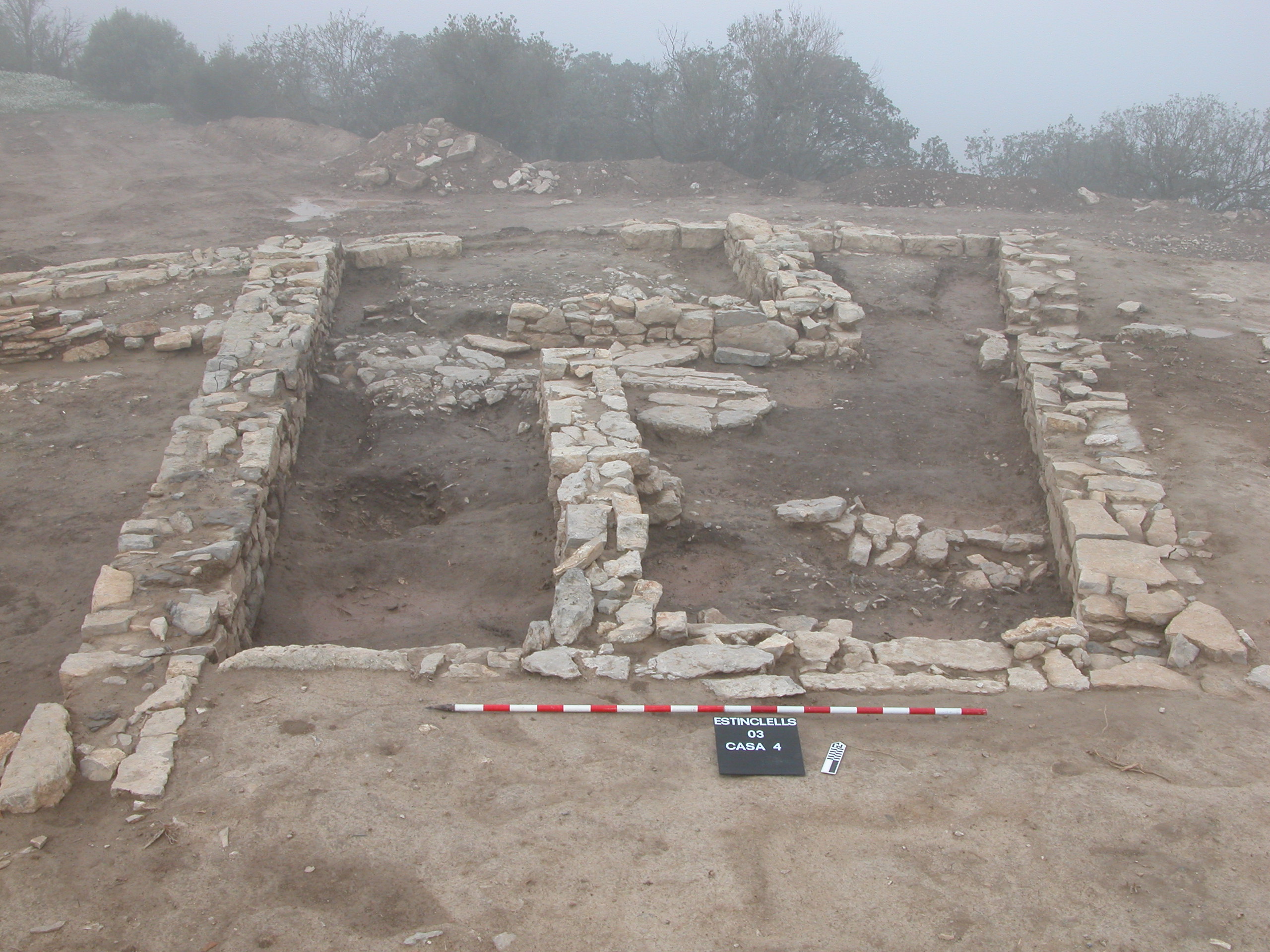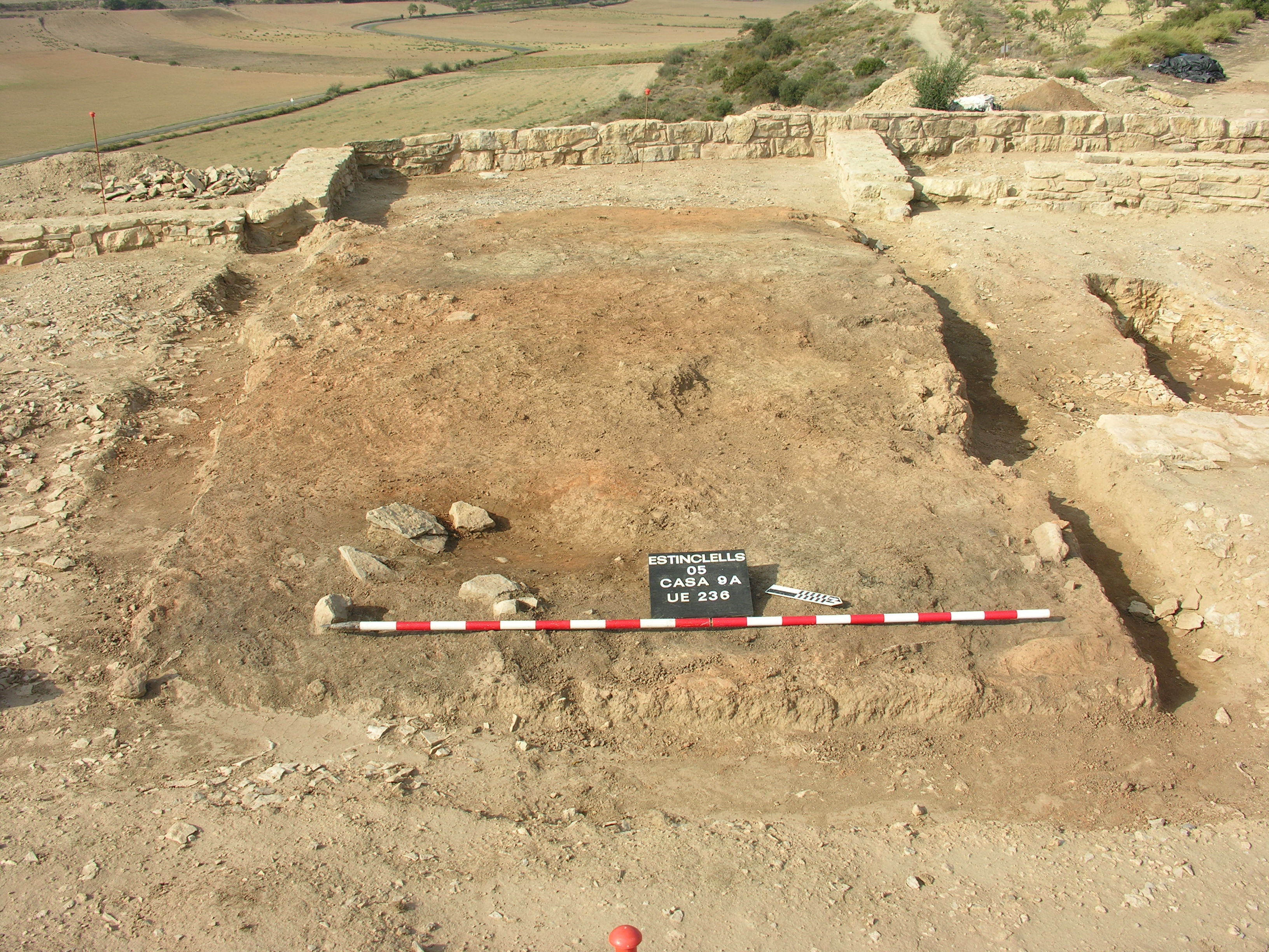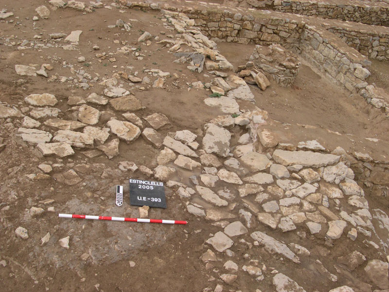 L'evidència arqueològica marca per als Estinclells una sola fase d'ocupació amortitzada a finals del segle III aC. Tot plegat presenta un abandonament força coherent i homogeni ben datable a l'entorn del 200 aC, en relació als esdeveniments històrics relacionats amb la Segona Guerra Púnica. Es documenten nivells d'incendis en algunes cases (casa 9, 10, 17, 19)obeint segurament a saquejos puntuals, tot i que la majoria de recintes semblen abandonats intencionalment, amb presència de pocs objectes i amb alguns tapiats intencionals de les portes de les cases i de la porta d'entrada al poblat. La fortalesa dels Estinclells està formada bàsicament per un seguit d'elements defensius, fossar i muralla, una bateria de cases i una bassa. Es tracta d'un conjunt d'estructures força complet i relativament ben conservat. Fossar extern de barrera El fossar de barrera està situat en el punt de més fàcil accés, a l'exterior del perímetre emmurallat, a uns 3 metres de la fonamentació de graves on s'assenta la muralla. Aquest element defensiu fa una amplada de 5,5 metres, una llargària de 48 metres i una fondària de 1'70 m. El fossar es troba excavat a les argiles naturals. Consta també d'un mur de contenció o escarpe, de prop d'un metre d'ample, resseguint el tall de la banda més propera a la muralla. El fossar separa totalment l'extrem oriental del turó on s'assenta la fortalesa de la resta de la plataforma elevada. Pel que fa les bandes sud, est i nord del jaciment, la pròpia orografia del tossal ja actua de defensa natural. Muralla La muralla que envolta i protegeix l'assentament és elipsoidal, amb una amplada de 1,20 metres. Està construïda amb blocs de blocs de pedra calcària de grans dimensions amb un farciment intern de fang i pedres de petita i mitjana dimensió. El tram millor conservat és el de la banda oest i sud-est, tot i que en la seva major part la muralla ha estat desmuntada per construir marges de pagès. També es documenta de forma molt precària al tram nord. En aquest cas és substancialment més estreta (entre 70 i 100 cm). L'entrada a la fortalesa es troba a l'angle nord-oest del recinte. Aquí conflueixen els dos trams de muralla i es crea un passadís de 9 metres de llarg i entre 2'5 i 2'8 metres d'amplada. A l'extrem occidental d'aquest passadís s'ubicaria la porta d'entrada més externa (n'hi podria haver una segona a la part posterior del passadís, a l'alçada final de la casa 10). Cal dir que seria versemblant imaginar que en el coronament d'aquest passadís d'accés s'instal·lés un segon pis, fet amb materials peribles, en forma de torre, que reforçaria la defensa d'aquest punt d'entrada a l'assentament. Urbanisme Pel que fa a les edificacions aparegudes, podem dir que tenim 24 edificacions repartides en dues bateries de cases separades físicament per una rasa i un espai central lliure d'edificacions. La bateria gran correspon a un barri residencial de cases grans i complexes a les qual s'hi accedeix des d'un carrer principal. El barri septentrional consta de cinc cases simples de funcionalitat incerta. L'estat de conservació d'aquestes estructures és molt bo ja que el terreny pràcticament no s'ha conreat i només es troba afectat per uns quants forats de plantació corresponents a oliveres que van ser arrencades fa poc més de 10 anys. La major part d'estructures corresponents a les cases apareixen sota una prima capa de superficial, sota del qual es documenta un nivell d'enderroc de pedres i tovots i un paviment que són les graves o les argiles naturals retallades per tal d'anivellar el terreny. Les cases presenten plantes rectangulars, quadrades i d'altres trapezoïdals. Es documenten tres tipus de planta amb unes superfícies que oscil·len entre un mínim de 12 m 2 i un màxim de 60 m 2 . Un primer tipus d'habitatge és de planta trapezoïdal i complexa, dividit en 3 o 4 recintes com a mínim i ocupen un solar d'entre 50 i 60 m 2 .Les cases d'aquest tipus habitualment tenen indicis de presentar un segon pis com a lloc preferencial de l'habitatge. Aquest grup d'habitatges es presenten tots agrupats al sector sud del poblat, adossant-se al pany principal de muralla i propers a la bassa (Cases 1, 2, 3, 4, 5 i 6) Un segon tipus de casa serien les de planta trapezoïdal simple i que ocupen una mitjana de solar a l'entorn dels 33 m 2 i generalment apareixen dividides en dues estances. Les cases d'aquest tipus conformen el grup més nombrós del poblat: cases 7, 8, 9, 10, 11, 13, 14, 15, 16, 17, 18 i 19. Aquests recintes no aporten indicis clars de tenir segon pis. Són aquest tipus de cases les úniques que presenten traces d'incendi, tot i que sembla clar que fou una destrucció no sobtada o violenta, ja que tant a la cas 9 com a la 10, un cop excavades les cendres i el material cremat, apareixen uns paviments buits de materials mobles metàl·lics o ceràmics in situ. El tipus d'habitatge més simple seria el de les cases de planta quadrangular que ocupen uns solars d'entre 10 i 12 m2). Aquestes cases presenten una sola estança, els sòcols conservats estan fets de pedra de petita dimensió lligades amb poc morter de fang, gairebé en sec. En els Estinclells, ara per ara documentem un total de 5 cases d'aquest tipus (casa 20, 21, 22, 23 i 25), totes estan situades al cantó est del poblat formant un barri estructurat i diferenciat de la resta de l'assentament. Bassa Un altre dels elements primordials a destacar és el d'una bassa o cisterna que ocupa part de l'espai central lliure del poblat. La cisterna és a la vegada una de les rares expressions en el món ibèric d'una gestió comuna dels recursos naturals Presenta una planta de forma ovalada irregular a la part superior i més acurada a les cotes inferiors . Fa 8'30 m de llarg per 6'60 d'amplada. La fondària màxima és de 2'35 m, apreciant-se a la part baixa un acabat còncau en forma de banyera. A aquesta bassa s'hi accedia per dues rampes, una de 0'70 m d'amplada a la part no