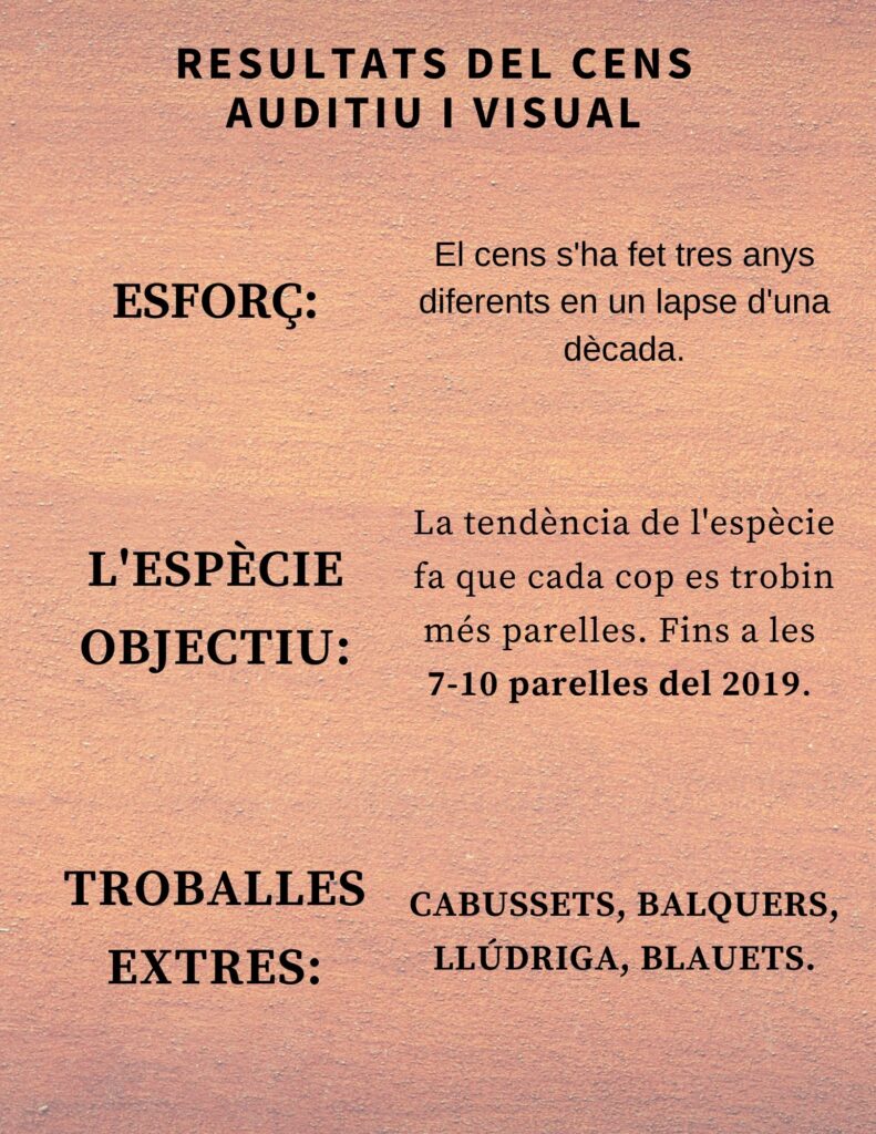 Com que aquest any no han pogut realitzar-lo degut al Còvid-19 hem estat uns quants del GNS que hem tornat a fer el cens aquest estiu amb resultats semblants a anys anteriors amb un total d’uns 900 nius observats dels quals més de la meitat estaven ocupats. Cal destacar les zones de la Camp del Molí, la Cissa, la Plana i la Catedral com a llocs on s’han trobat la majoria dels nius d’aquesta oreneta que cada any fa el recorregut des d’Àfrica fins a casa nostra.