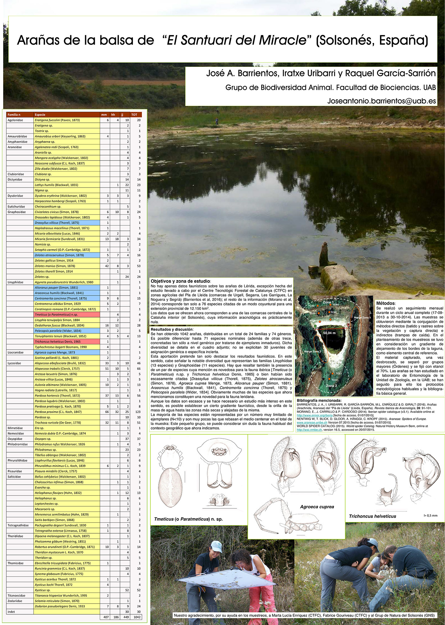 Us presentem el póster que es presentarà a les XVI Jornadas del Grupo Ibérico de Aracnelogia i realitzat per José A. Barrientos, Iratxe Uribarri i Raquel García-Sarrión del Grup de Biodiversitat Animal. Facultat de Biocièncias. UAB.