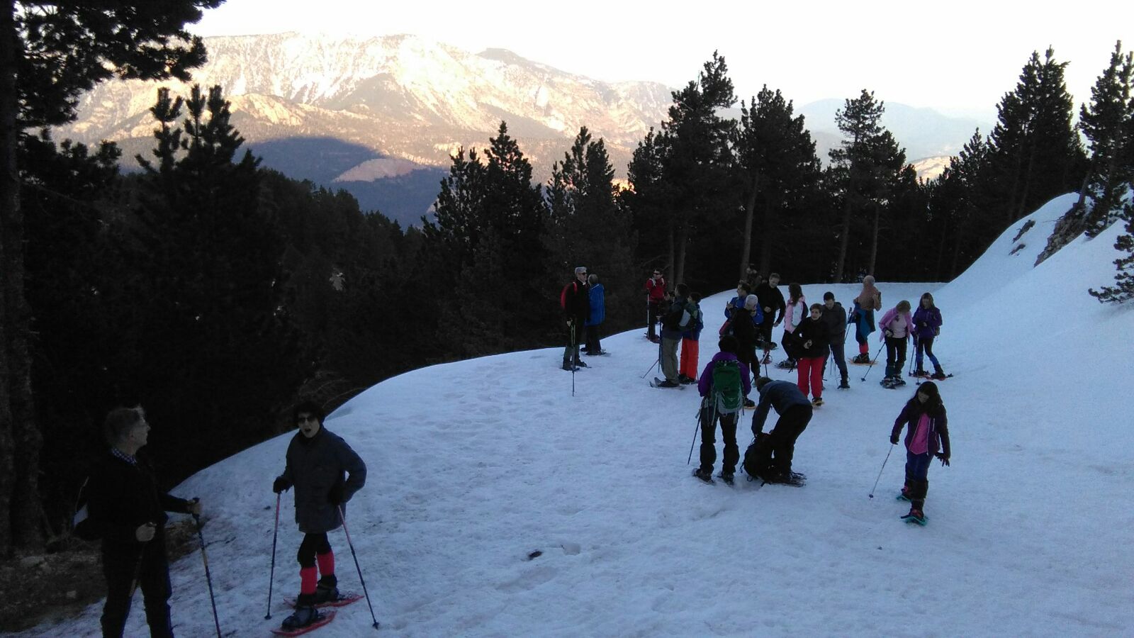 Dissabte feia una temperatura molt agradable fins que va marxar el Sol; va ser llavors que vam poder veure sortir la Lluna gairebé fent el ple. Davant nostre vam poder contemplar la serra del Verd amb el Pedraforca darrere i la serralada del Cadí encara ben nevada.