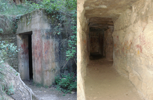 | El refugi, que es va excavar en la roca del marge muntanyós, constava de dues entrades separades per una quinzena de metres i una galeria circular d'uns 50 metres de llargada, amb una petita cambra lateral i una cambra més ampla al fons |
